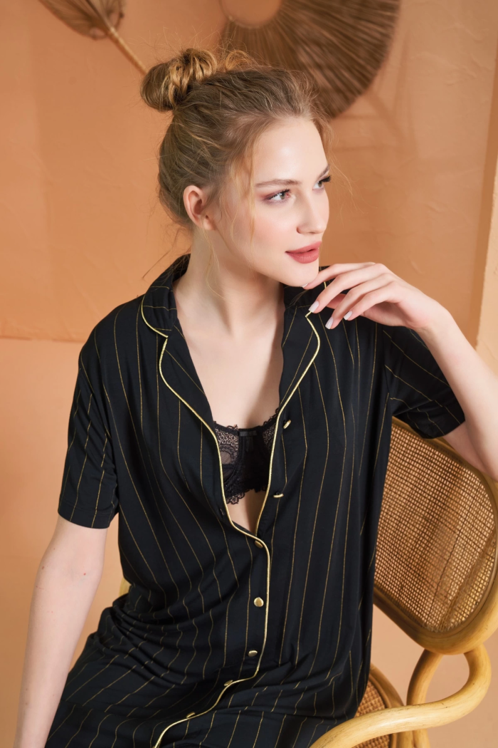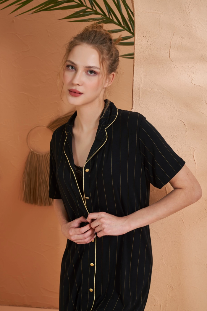 Pjs 27043 Kadın Kısa Kol Çizgili Önü Düğmeli Gecelik