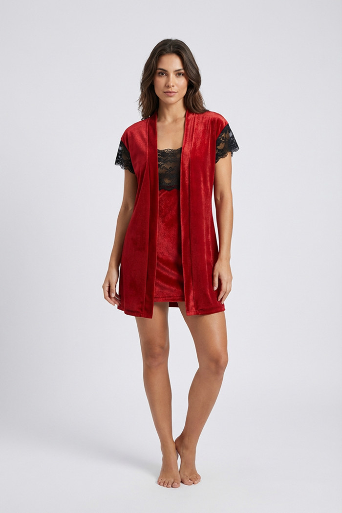 Kırmızı Kadife Sabahlık & Gecelik Takım 2' Li - 1428